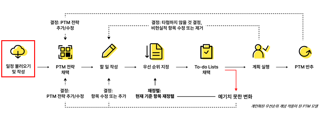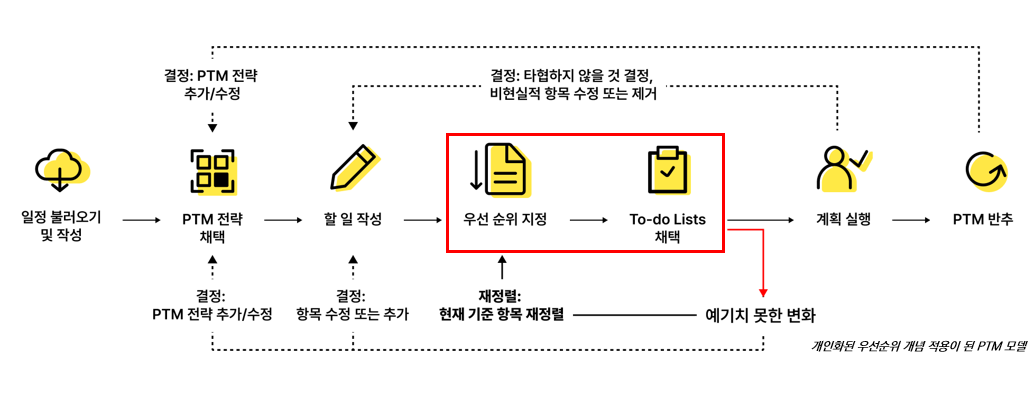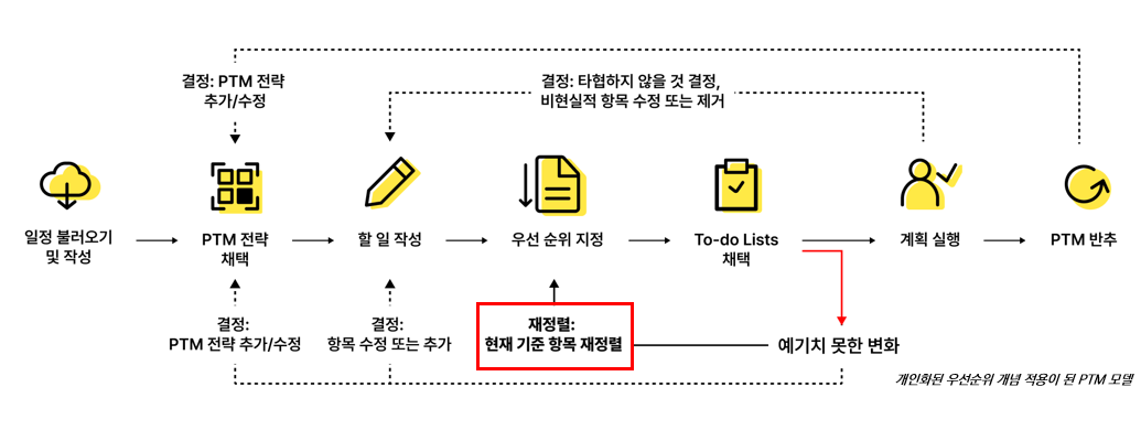 In particular, existing personal task management tools tend to focus on recording and tracking what needs to be done, while offering limited support for flexible replanning that reflects users’ different situations and strategies. In response, this project aimed to propose a new model for a PTM tool that allows users to configure personalized prioritization rules, automatically reorder tasks when unexpected changes occur, and operate through a to-do-list-centered structure rather than a calendar-centered one.
