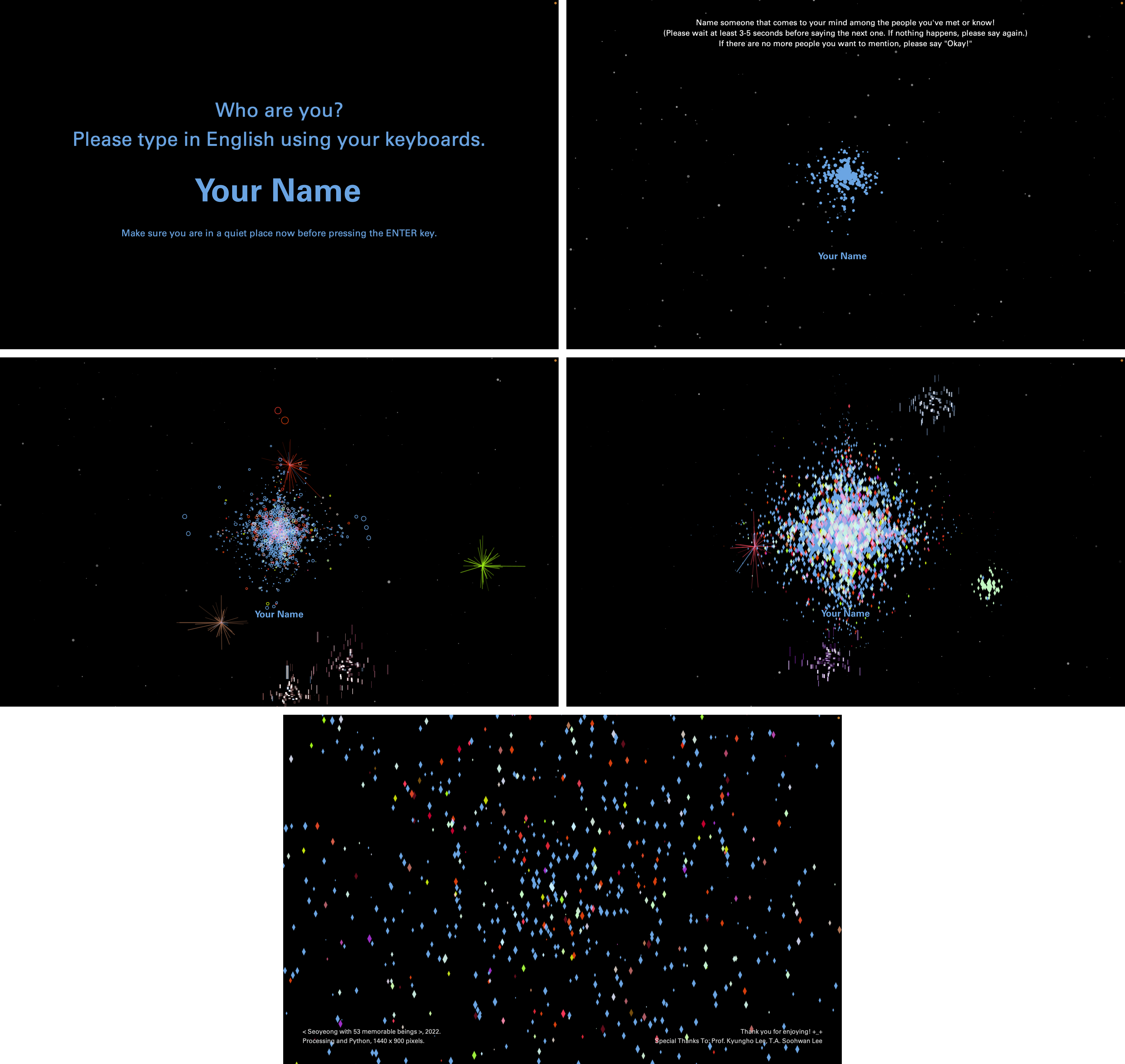 - The work takes input through a keyboard and microphone. When viewers type their own name, a star representing themselves appears at the center of the screen. When they then speak the names of others into the microphone, each name generates a new particle-based celestial body.