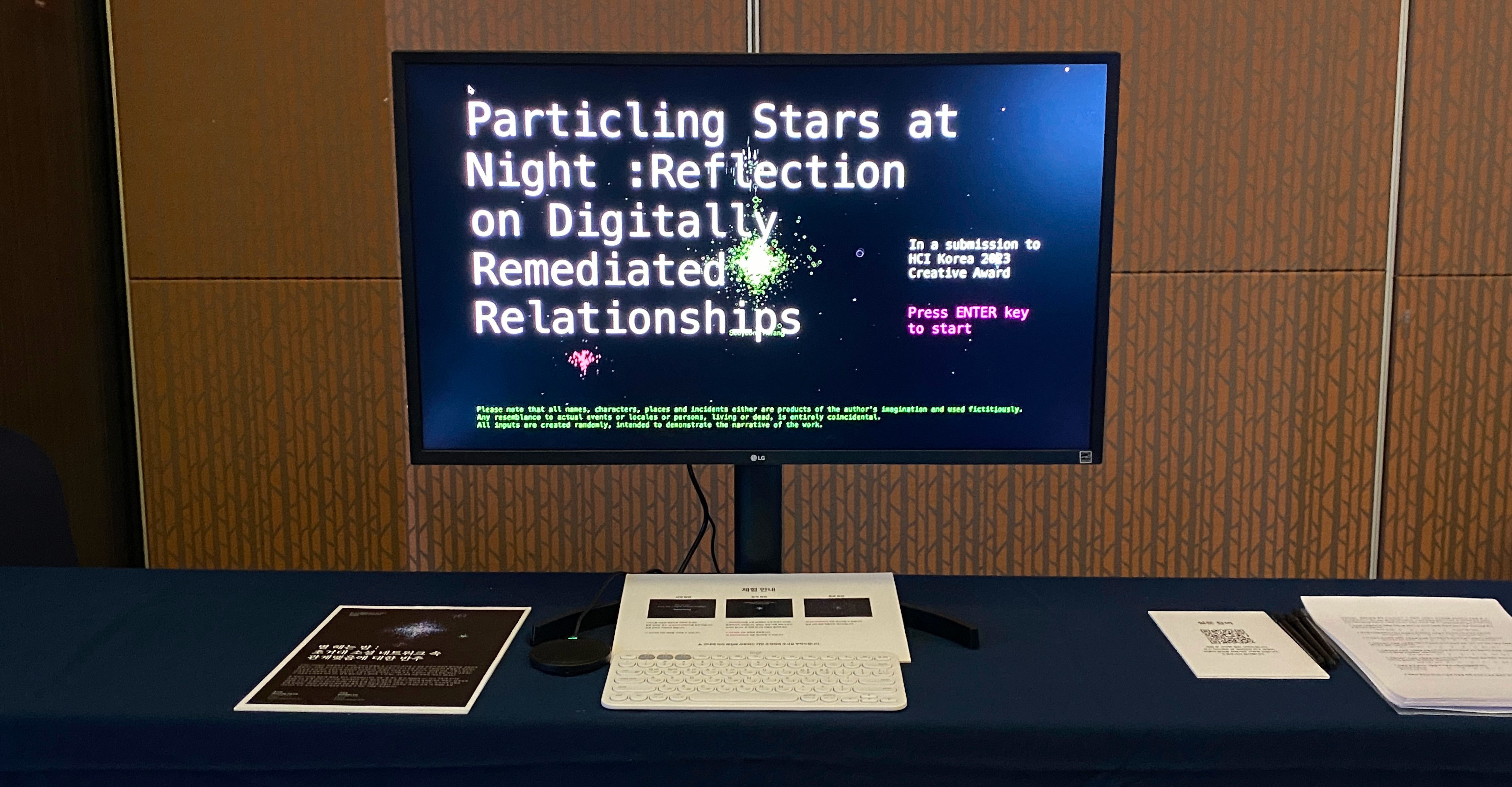 Particling Night is an interactive media artwork that invites viewers to reflect on the meaning of the relationships they form within the vast universe of social networks. Just as Yoon Dong-ju’s poem Counting the Stars at Night layers stars and the night sky with memory, longing, transience, and an ideal world, this project also uses the metaphor of the universe and stars to express relationships and their lingering traces. It proposes an experience through which viewers can reflect on their human relationships and cultivate self-resilience through artistic experience.