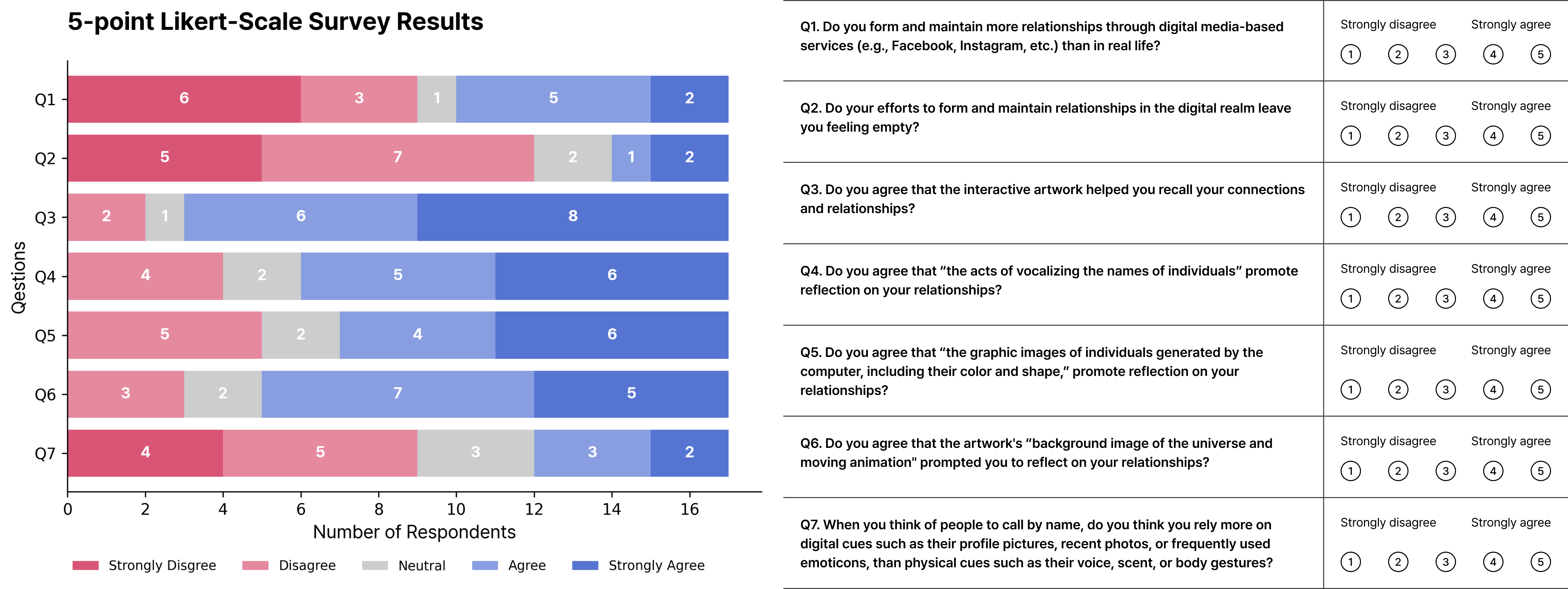 전시 후에는 5점 리커트 척도 7문항으로 구성된 설문을 진행하였습니다. 문항은 크게 세 범주를 다루었습니다.